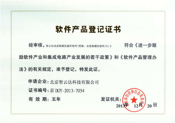 軟件產品登記證書——智云達水質檢測儀操作軟件