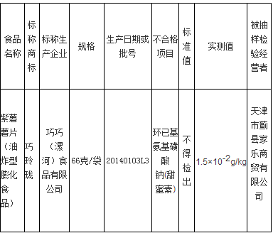 經(jīng)檢測,標(biāo)稱巧巧(漯河)食品有限公司生產(chǎn)的一個批次“巧玲瓏” 紫薯薯片(油炸型膨化食品)(66克/袋 20140103L3)環(huán)已基氨基磺酸鈉(甜蜜素)超標(biāo),標(biāo)準(zhǔn)要求不得檢出,實(shí)測值為“1.5×10-2g/kg”。