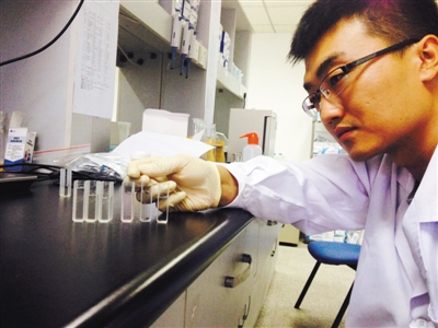 12日,北京智云達食品安全檢測消費者體驗中心,實驗人員先對泡椒鳳爪樣品進行了雙氧水快速檢測,結果顯示六種樣品中均未含雙氧水。隨后進行的防腐劑山梨酸測試結果顯示,一種樣品溶液為粉紅色(圖)。