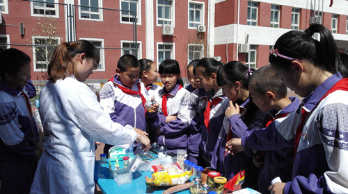 技術(shù)人員指導(dǎo)小學生現(xiàn)場動手實驗檢測地溝油