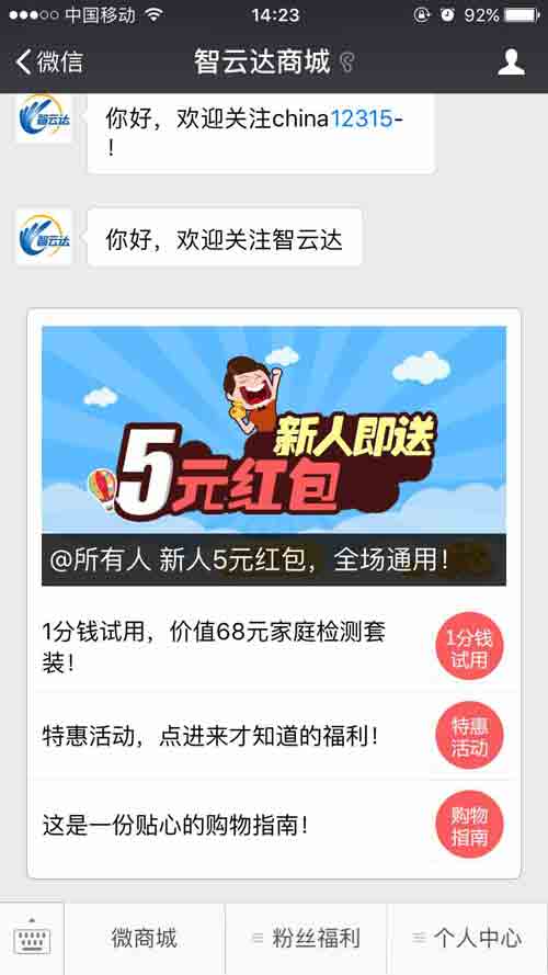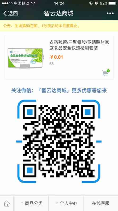 當(dāng)下微信人群活躍度高,微商城的開(kāi)通為消費(fèi)者在隨時(shí)隨地選購(gòu)食品安全快速檢測(cè)產(chǎn)品開(kāi)通一條更為優(yōu)惠、方便的購(gòu)物通道。那么如何在智云達(dá)商城購(gòu)買(mǎi)產(chǎn)品?
