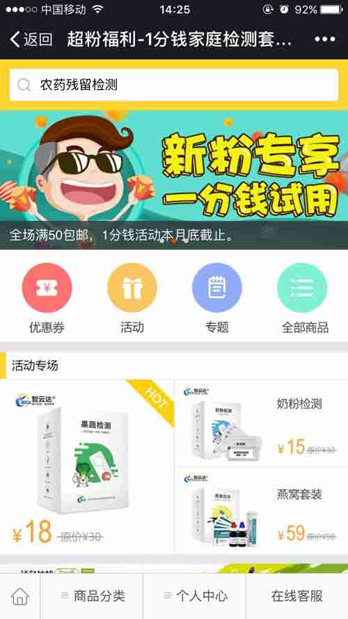 商城開(kāi)業(yè)特推出一分錢(qián)試用活動(dòng),價(jià)值68元的食品安全家庭檢測(cè)套裝只要一分錢(qián),一分錢(qián)能買(mǎi)到什么,你沒(méi)聽(tīng)錯(cuò),可以檢測(cè)農(nóng)藥殘留、三聚氰胺、亞硝酸鹽,名額有限,檢測(cè)套裝帶回家。