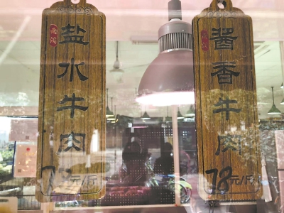 順著男店員的指點,屠先生看到擺在桌上的醬牛肉和鹽水牛肉,的確品相都很不錯,屠先生選擇了鹽水牛肉。隨后,男店員揀出一塊適合屠先生大小要求的鹽水牛肉,放進該店提供的盒里,將牛肉和盒子一起稱重:“鹽水牛肉58元一斤,你選的這塊一共是28.4元,夠嗎?”“夠了,就中午吃一頓。”屠先生說。