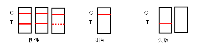 無效反應:C線不顯色,無論T線是否顯色,該檢測卡均判為無效。未出現C線,表明操作過程不正確或檢測卡已變質失效。在此情況下,應再次仔細閱讀說明書,并用新的檢測卡重新測試。