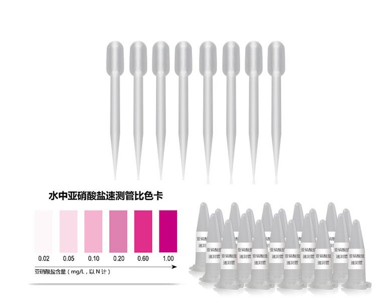 1. 直接取1.0mL水樣加入到速測管中進(jìn)行檢測,振搖使試劑溶解,靜置10min后與比色卡對比,取相同或相近色階上標(biāo)示值即為樣品中亞硝酸鹽的含量(以氮計)。