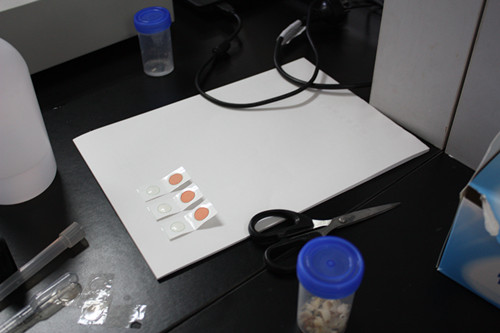 2、取農藥殘留檢測卡,將西紅柿樣品提取液的液滴滴在白色藥片上,放置 10min 進行預反應,預反應后的藥片表面必須保持濕潤。