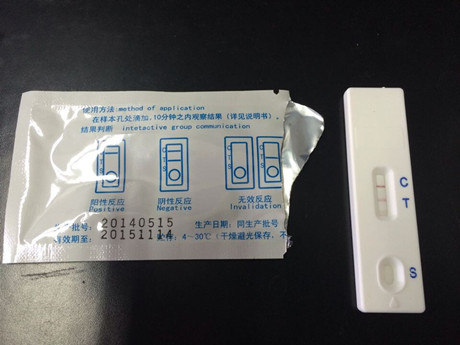 3、吸取待測樣品溶液,緩慢滴加80~100μl(約3~4滴)樣品液于加樣孔中,開始計時,在3~5分鐘內讀取結果。