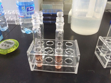 3、 樣品管:分別取0.4mL樣品液于10mL比色管中,做平行測試,分別加B溶液1mL、C溶液0.2mL,混勻,加D溶液0.4mL,搖勻,再加E溶液0.4mL,立即用蒸餾水稀釋至5mL刻線,搖勻,靜置20min,進行檢測。空白管:不加E溶液,其余步驟與樣品管同。