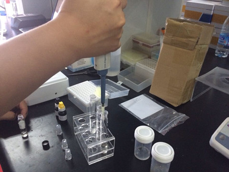 2、 取3根試管,1、2號試管作為樣品管,3號為對照管。在樣品管加入3ml樣品液,在對照管中加入3ml緩沖液,隨后分別加入20ul顯色劑和50ul酶試劑,蓋塞混勻靜置10min。加入20ul底物,混勻后迅速倒入比色皿,放入農(nóng)殘儀進(jìn)行檢測。
