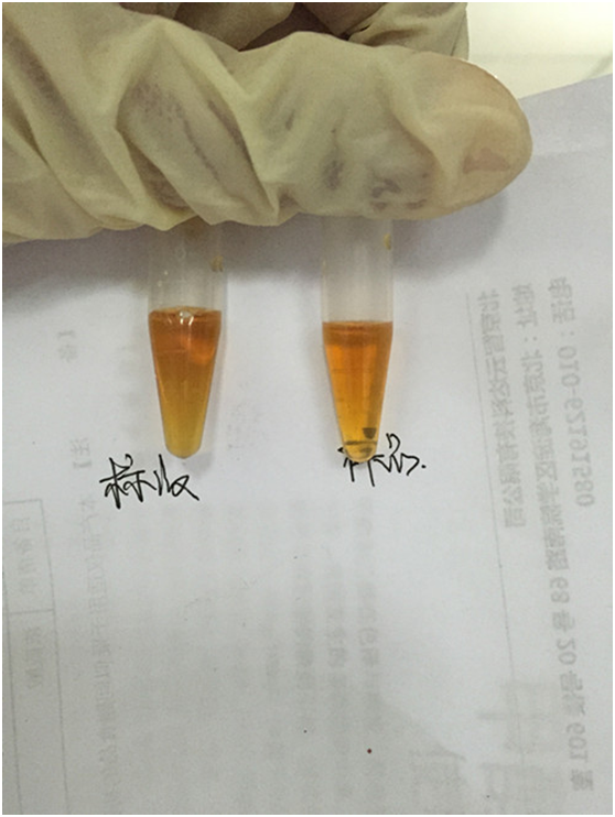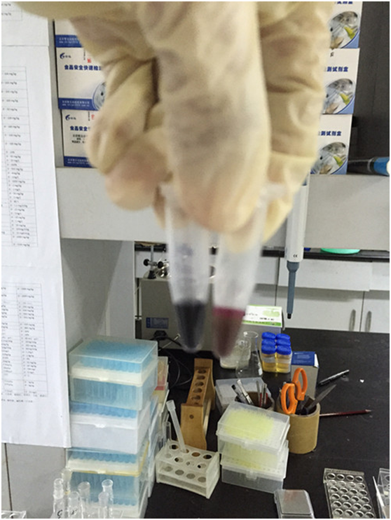 用滴管取0.04%甲醇標液、酒樣各6滴于兩個離心管中,各加入5滴試劑1,放置5分鐘。